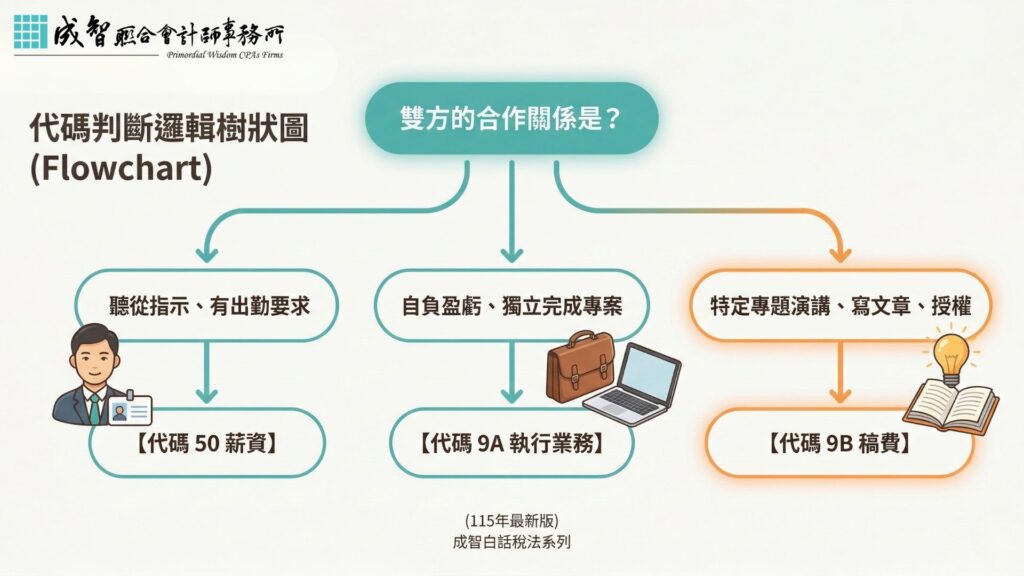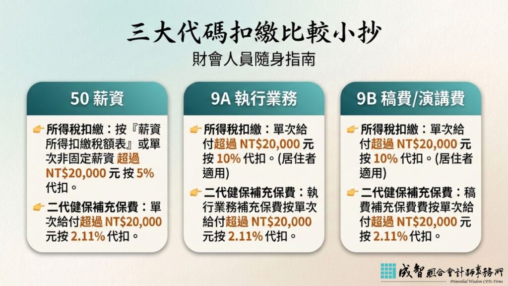 - 再看「金額」算扣繳:眼睛緊盯 20,000 元(針對 9A/9B)與 當年度基本工資(針對兼職 50)這兩個關鍵門檻。一旦達標,立刻啟動 10% 所得稅與 2.11% 二代健保的計算機。