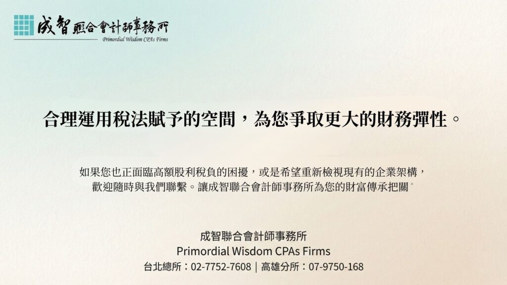 如果您也正面臨高額股利稅負的困擾,或是希望重新檢視現有的企業架構,歡迎隨時來找我們聊一聊。讓成智聯合會計師事務所用冷靜、理性的專業,為您量身打造專屬的財務防護網,讓稅務成為您財富管理的助力,而非阻力。