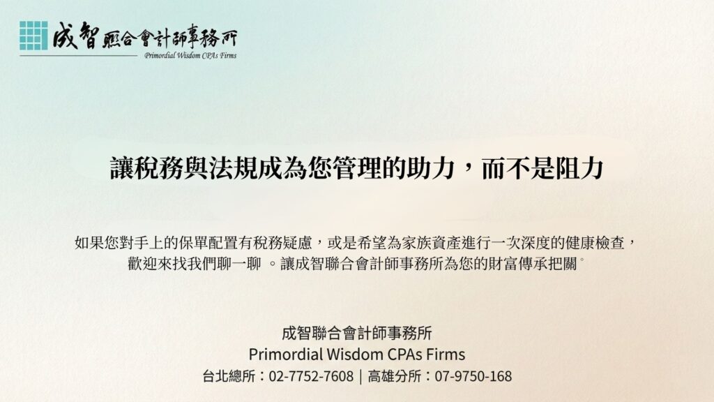 資產傳承是一場需要理性規劃與長期佈局的馬拉松。保險規劃不只是買商品,更是家族資產配置的重要一環。如果您對手上的保單配置有稅務疑慮,或是希望為家族資產進行一次深度的健康檢查,歡迎來找我們聊一聊 。讓成智聯合會計師事務所為您的財富傳承把關,讓稅務成為您企業與家族管理的助力,而非阻力。