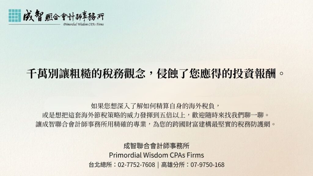 每年 750 萬的免稅額度,是國家給予合法申報者的紅利。如果您想深入了解如何精算自身的海外稅負,或是想把這套海外節稅策略的威力發揮到五倍以上,結合家族整體的傳承架構,歡迎隨時來找我們聊一聊。讓成智聯合會計師事務所用精確的專業,為您的跨國財富建構最堅實的稅務防護網。