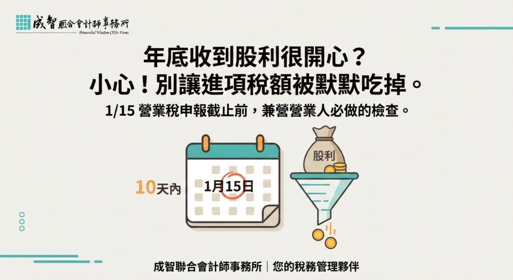 扣繳小幫手, 稅務知識庫年底收到股利很開心?小心 1/15 前少做這一步,進項稅額被「吃掉」 發佈於 2026-01-092026-01-09 by 成智聯合會計師事務所 給兼營營業人的歲末提醒:善用「直接扣抵法」,讓稅務成為獲利的守護盾。 歲末年終的「隱形」稅務風險 又到了 1 […] 閱讀更多→