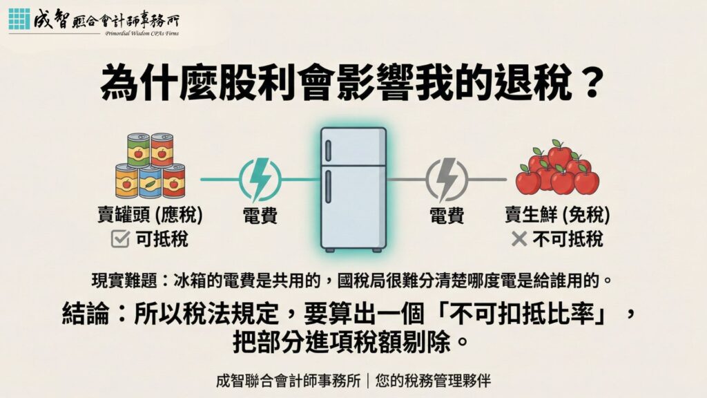在營業稅法的邏輯裡,當一家公司同時擁有「應稅收入」(如:賣產品)與「免稅收入」(如:股利投資)時,就稱為「兼營營業人」。