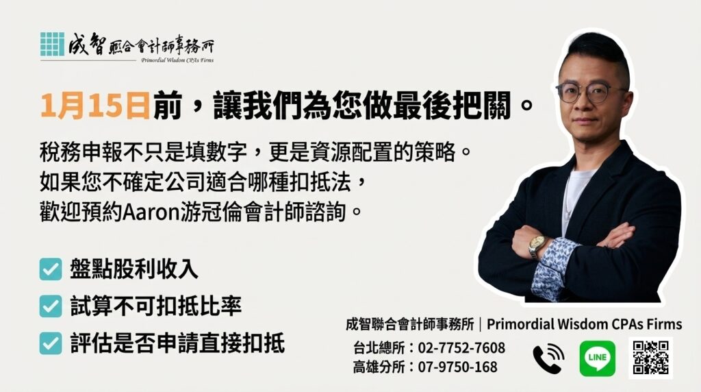- 關鍵決策:若股利金額龐大,請務必評估是否申請改採「直接扣抵法」,這往往能為公司省下可觀的稅務成本。